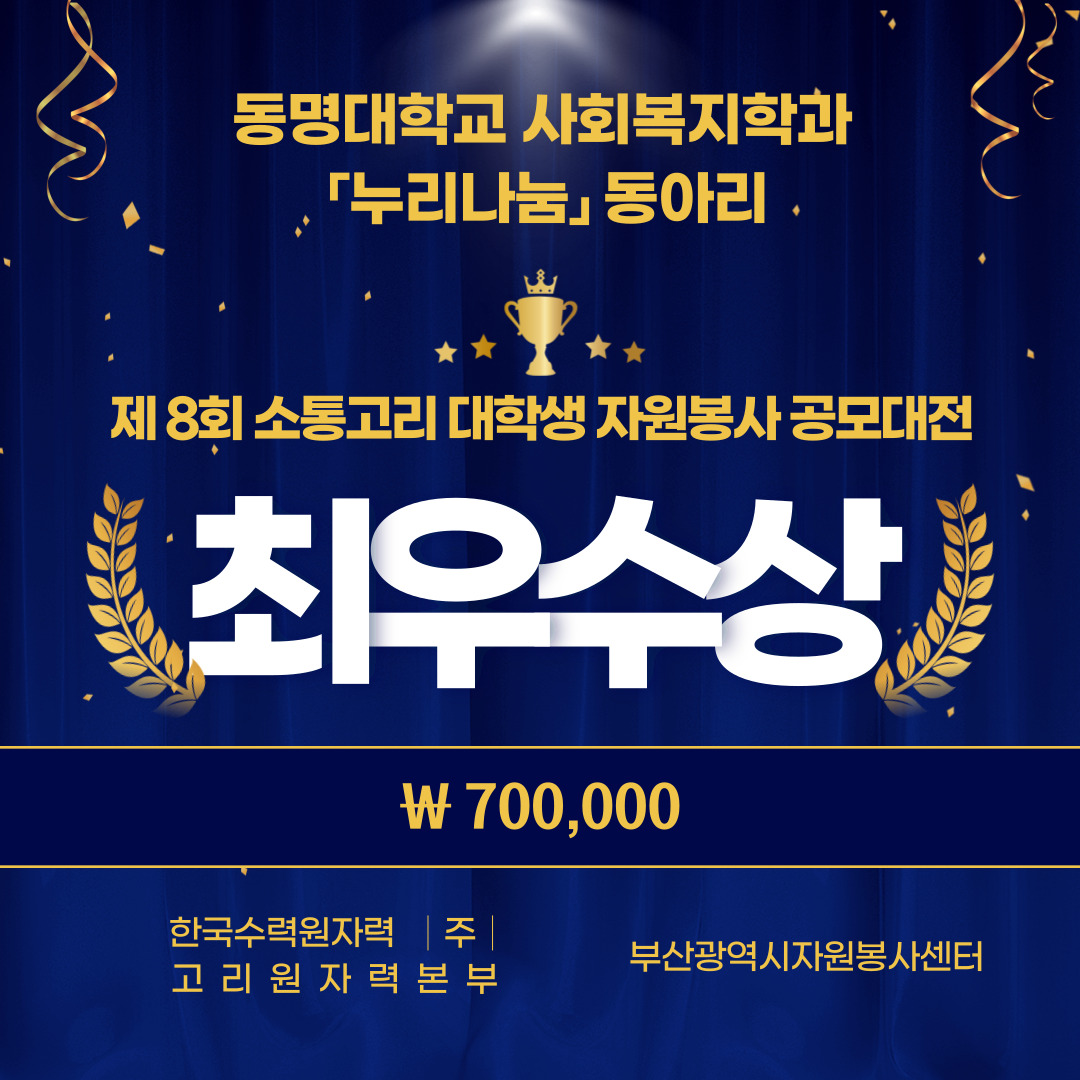 제8회 소통고리 대학생 자원봉사 공모대전 최우수상 수상〈언어발달 지체 영유아의 언어학습 프로그램 "동화 속 바름(발음) 놀이동산"(용당어린이집 7회기 진행)〉 - 2021.08.