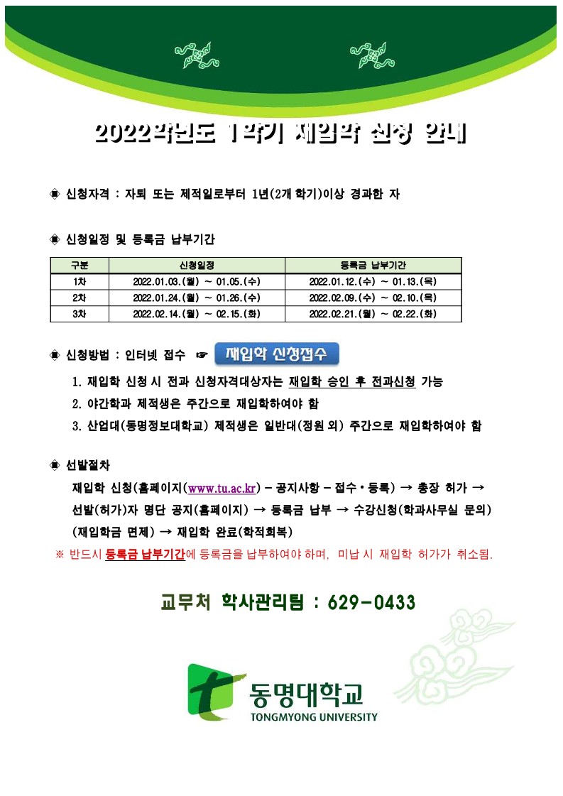 2022학년도 1학기 재입학 실시 및 신청 안내