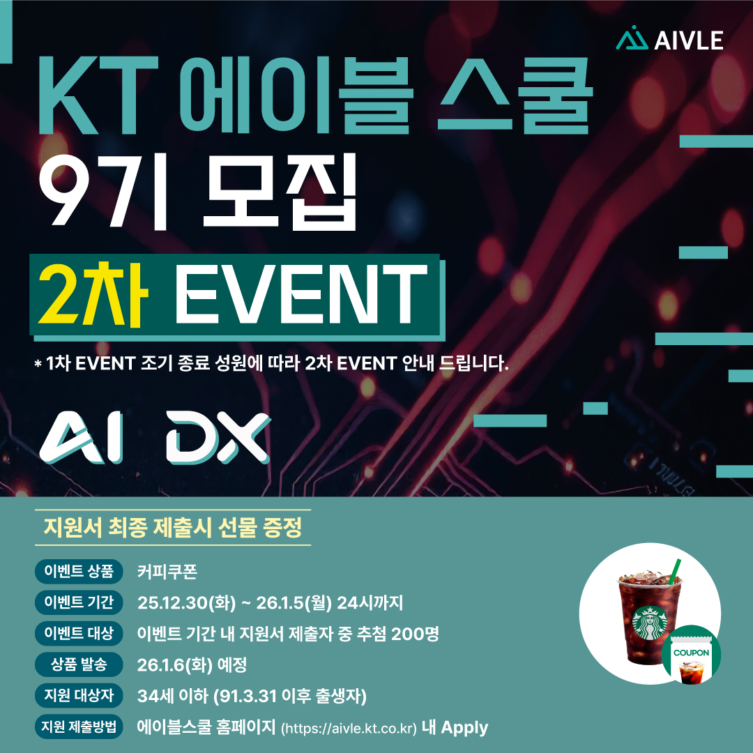<KT AIVLE School(KT 에이블스쿨) 9기 교육생 모집> (학교 추천으로 서류면제!!)