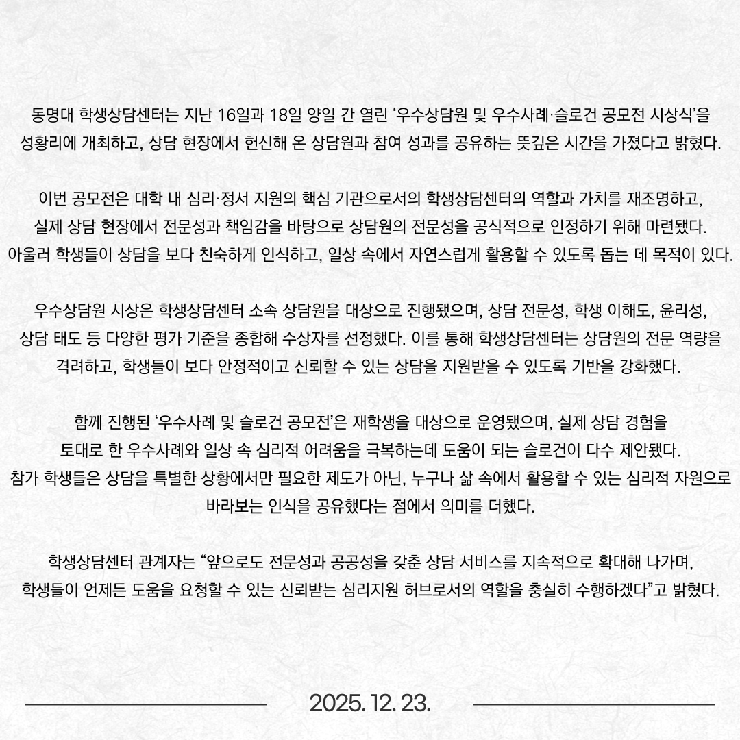 학생상담센터, 우수상담원 및 우수사례·슬로건 공모전 시상식 성료