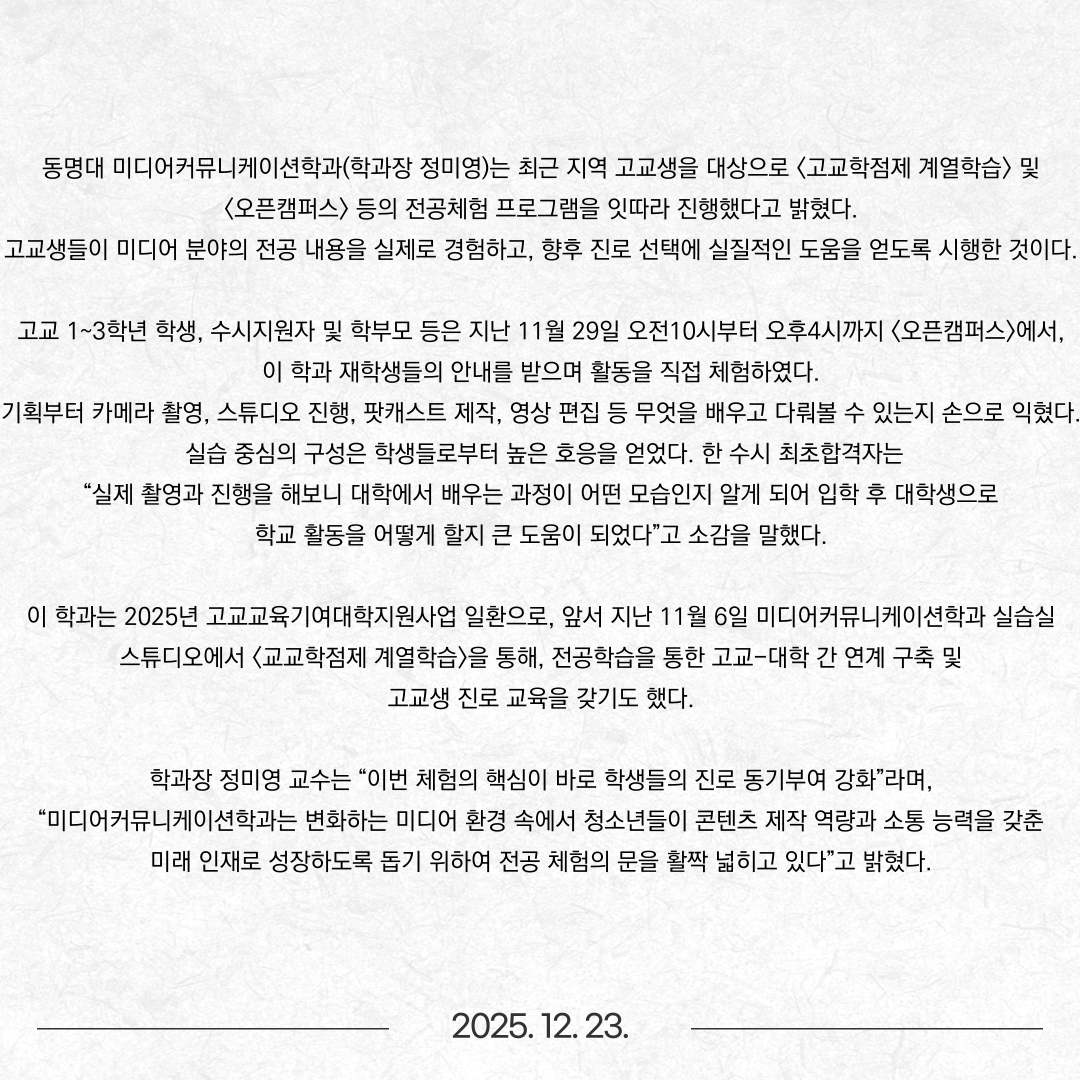 미디어커뮤니케이션학과 오픈캠퍼스 등 고교생초청 전공체험