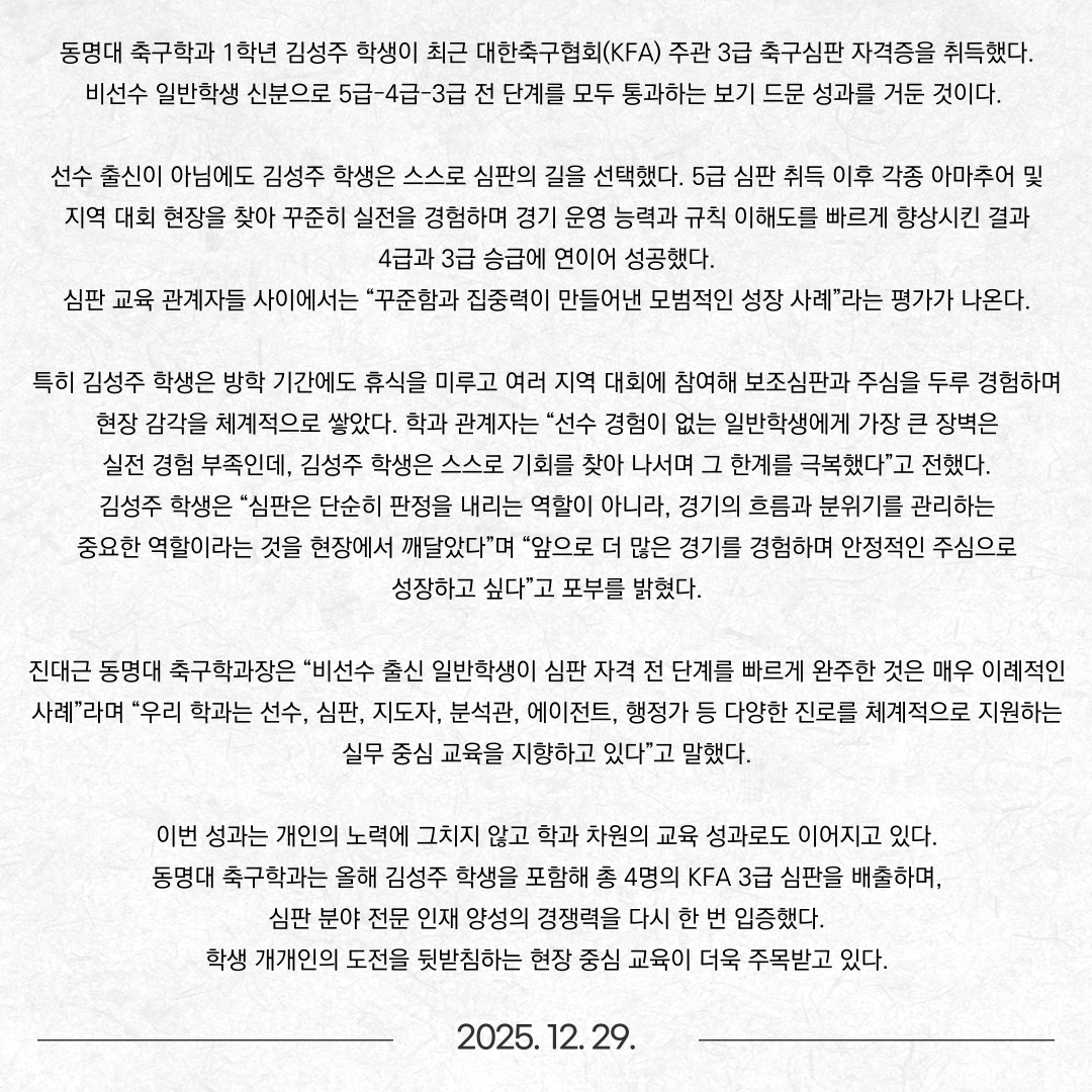 축구학과 1학년, 비선수에서 ‘3급 심판’까지 김성주 학생, KFA 심판 전 단계 완주 이례적 성과