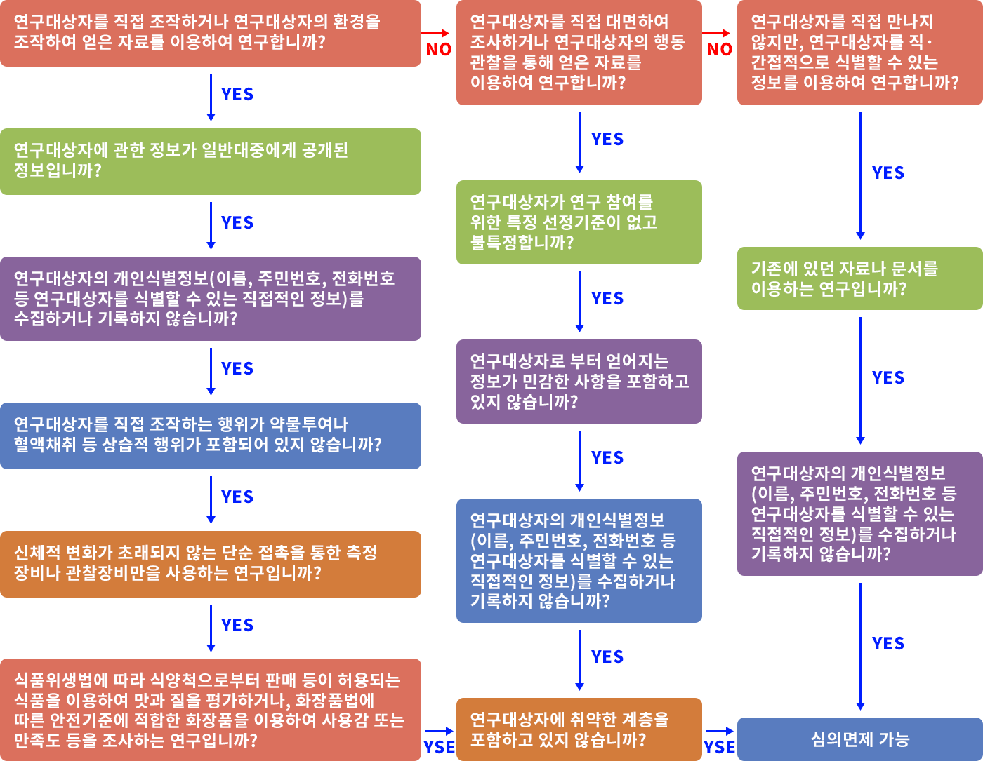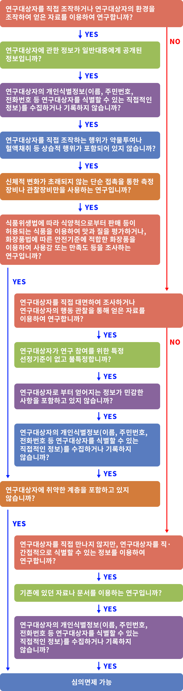 - 연구가 심의면제에 해당되는 경우 반드시 IRB에 심의면제 확인을 받아야 함(심의면제는 IRB의 결정사항이며 심의면제 해당여부를 확인하여 신청시 심의면제 신청서류를 추가로 제출해야 함)