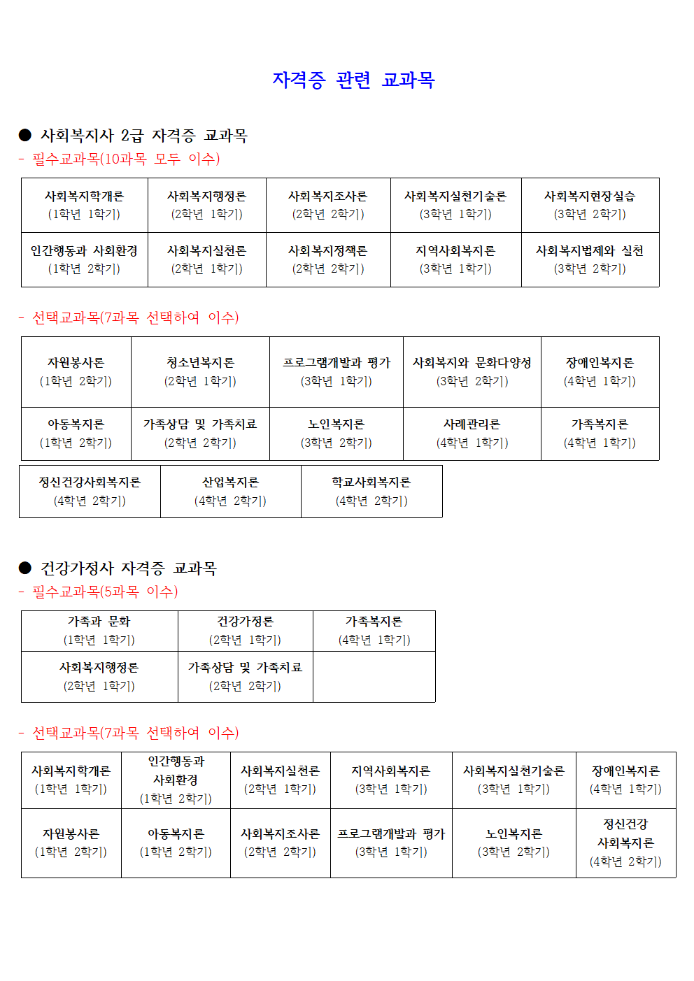 ※ 다만, 대학에서 사회복지학 또는 사회사업학을 전공하지 아니하고 동 석사학위를 취득한 자는 보건복지부령이 정하는 사회복지학 전공교과목과 사회복지관련 교과목 중 사회복지현장실습을 포함한(2004. 07. 31 이후 입학생부터 해당) 필수과목 6과목 이상(대학에서 이수한 교과목을 포함하되, 대학원에서 4과목 이상을 이수하여야 한다), 선택과목 2과목이상을 각각 이수하여야 한다.